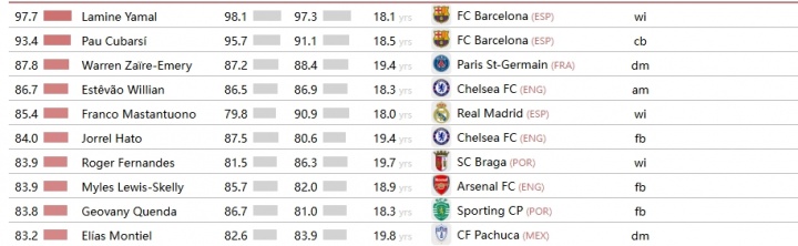 09月04日讯 著名足球数据统计机构cies,评选了2025年世界最强的200个U20球员,其中有3名中国球员入围。