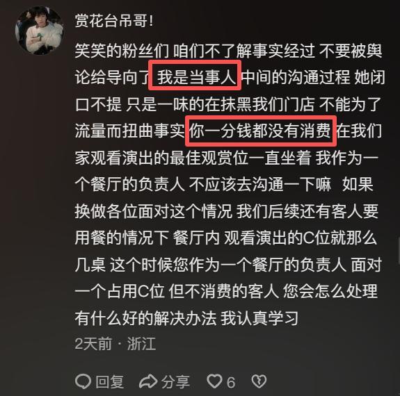 餐厅的当事男子也在博主评论区硬刚,称博主一分钱没消费,却一直坐在最佳观赏位,难道他还不能去沟通吗?