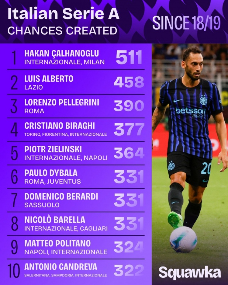 9月7日讯 《转会市场》统计了18-19赛季以来的意甲创造机会情况,恰尔汗奥卢独自领跑。
